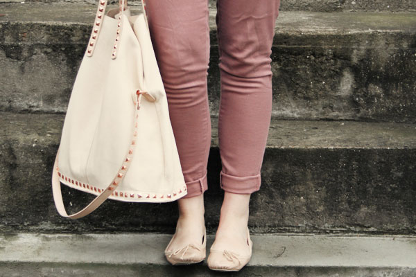 The grey, dreary scene outside my bedroom window had me searching my wardrobe for soft, pretty colours. These dusky pink jeans were crumpled up in the back of a drawer – hence the creases – but I think they’re a pretty good match for my much-adored rose gold studded Zara bag. Apparently I can’t even walk past a branch of Zara without ‘popping in’ and emerging 30 minutes later with a bag full of goodies – this silk and jersey tee is another recent purchase. I just can’t resist a studded shoulder!