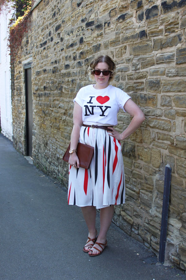 Vintage skirt, Beacon’s Closet; I <3 NYC tee, JKF airport; vintage bag, Housing Works in Chelsea, NYC; Kelly & Katie sandals